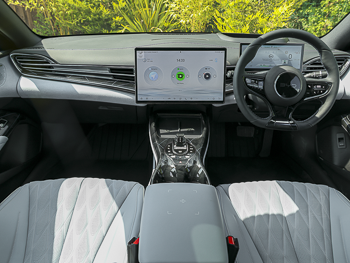 Here we're looking at the Seal saloon; there's also a 'Seal U' SUV body shape. In sedan form, this BYD is a fairly dramatic-looking thing, styled using the brand's current 'Ocean Aesthetics' design language, which includes a few gill and fin details to fit with the whole maritime theme. The penmanship comes from ex-Audi stylist Wolfgang Egger, whose CV includes the gorgeous Alfa Romeo Competizione 8C sports car. Seal measurements are 4,800mm in length, 1,875mm in width and 1,460mm in height; which makes the car 106mm longer, 58mm narrower and 17mm taller than its Tesla Model 3 arch-rival. Under the skin sits the same 'e-Platform 3.0' chassis as smaller BYD models, but the 'cell-to-body' battery installation that sits on top of it is different. Here, the battery pack is actually part of the vehicle structure - so there's no metal platform between the cabin floor and the lithium-ion cells. That means a thinner floor and a consequently lower roof height. You enter the cabin via neat retractable door handles and once inside, there's a smartly furnished interior with a 10.25-inch digital instrument panel and a big 15.6-inch infotainment touchscreen that, as with other BYDs, can be rotated between portrait and landscape layouts. The interior all feels suitably premium - more so than a rival Model S - and the seats (with their BYD-embossed headrests) not only look good but seem supportive. In the back, a 45mm advantage in wheelbase over that rival Tesla means a bit more leg-stretching space (though you can't push your feet very far under the front chairs). Headroom is a bit compromised by the sweeping rear roof line with its fixed panoramic glass top. Because this isn't a hatchback, you'll have to negotiate a rather narrow boot loading aperture, beyond which there's a reasonable 402-litres of capacity. Plus there's a further 53-litres in the 'frunk' beneath the bonnet - enough for a set of charging cables.